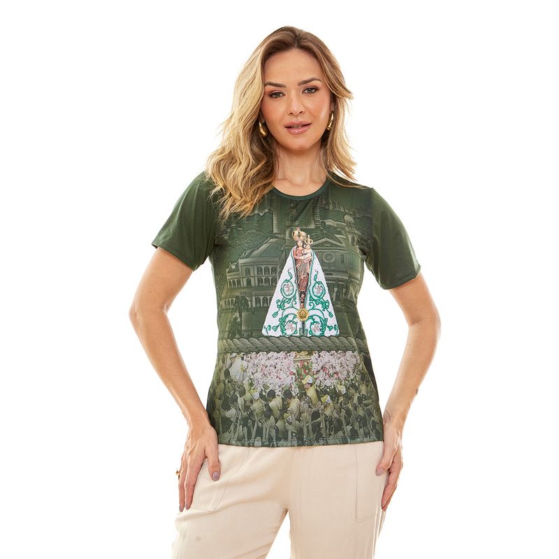 Baby Look católica Círio de Nazaré em linda estampa para expressar toda sua fé e devoção. Na cor verde musgo em malha muito confortável de um caimento perfeito no corpo. Sua estampa é um reflexo da intercessão de Nossa Senhora de Nazaré, que nos envolve em suas cordas de amor. Vista-se de amor. Use Ágape.