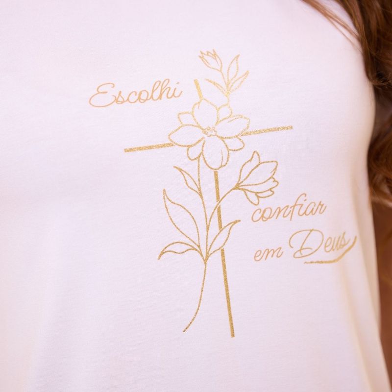 Estampa com frase devocional Eu Escolhi Confiar Em Deus. Mais que palavras, são valores para viver todos os dias. Esta baby look com manga princesa traz, em silk, os termos que traduzem a essência das promessas de Deus. Confeccionada em malha leve, fresca e confortável, ideal para o cotidiano, momentos em família e encontros de final de ano na paróquia.