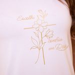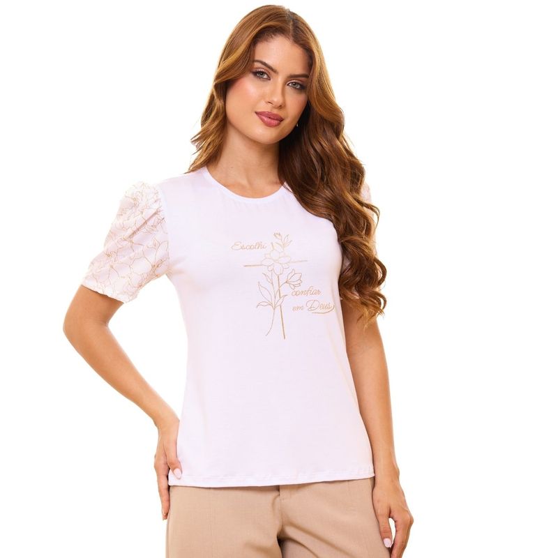Estampa com frase devocional Eu Escolhi Confiar Em Deus. Mais que palavras, são valores para viver todos os dias. Esta baby look com manga princesa traz, em silk, os termos que traduzem a essência das promessas de Deus. Confeccionada em malha leve, fresca e confortável, ideal para o cotidiano, momentos em família e encontros de final de ano na paróquia.