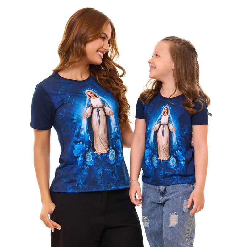 Na cor azul dark, a peça ganha profundidade e sofisticação, tornando-se um destaque no guarda-roupa devocional. Produzida em malha de qualidade, proporciona conforto, caimento perfeito e resistência, ideal para expressar a fé com elegância e devoção no dia a dia. Disponível na versão feminina adulta e infantil