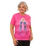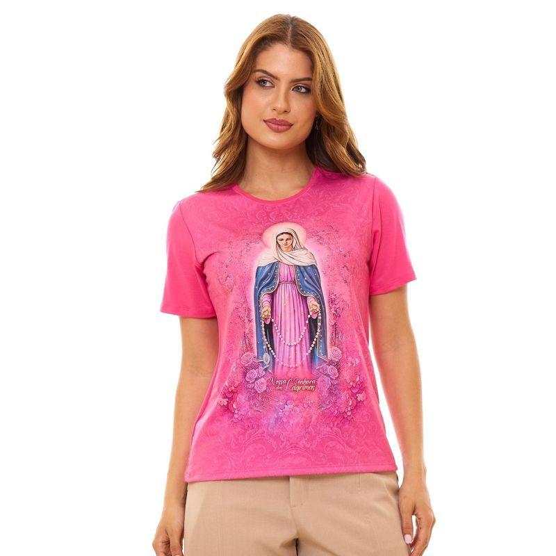 Na combinação de roxo e rosa pink, a peça une intensidade e delicadeza, tornando-se única e especial. Produzida em malha de qualidade, oferece maciez, resistência e conforto, perfeita para expressar a fé com devoção no dia a dia.