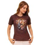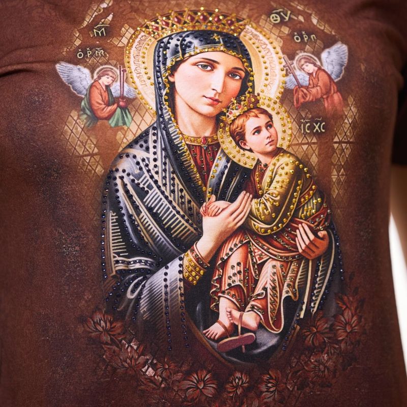 Maria, a Mãe que nunca abandona os seus filhos, é estampada nesta baby look em verde esmeralda com intensidade e profundidade. A estampa em sublimação traz o ícone do Perpétuo Socorro, tão amado pelos fiéis, na linda cor verde esmeralda e com aplicação de pedras que dão um toque iluminado todo especial.