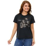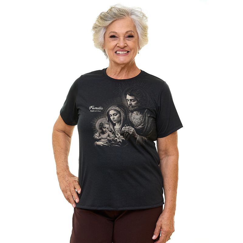 A família sagrada como inspiração para a sua. Esta camiseta preta traz a imagem da Sagrada Família com traços modernos em silk, expressando unidade, amor e entrega a Deus.