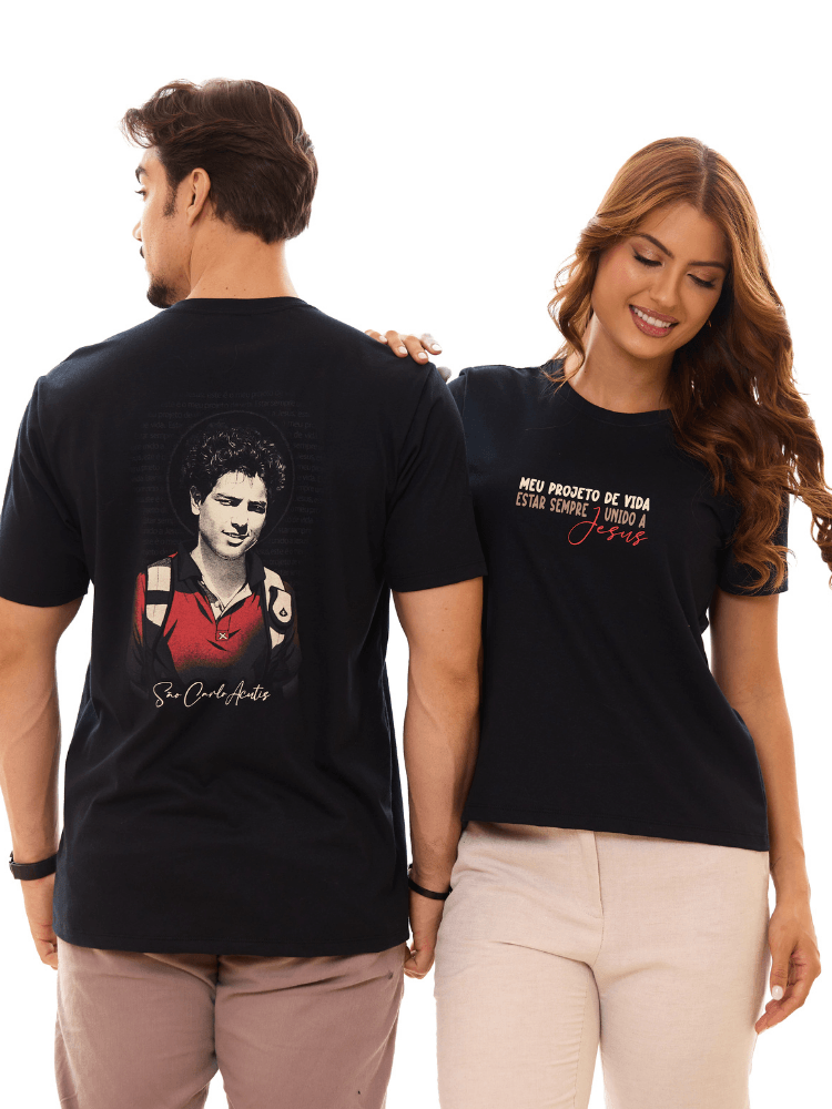 Camiseta com a imagem de São Carlo Acutis, em uma composição cheia de fé e reverência. Na cor preto, a peça transmite leveza e harmonia. Perfeita para ocasiões especiais levando sua devoção sempre junto com você. Disponível na versão masculina e feminina.
