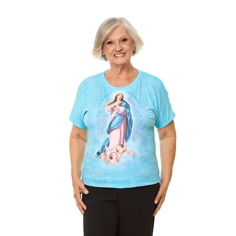 Blusa católica Imaculada Conceição com detalhes especiais da manga japonesa, na cor azul piscina, produzida em tecido de alta qualidade, proporciona conforto único, além do caimento perfeito no corpo. Vista-se de amor. Use Ágape.