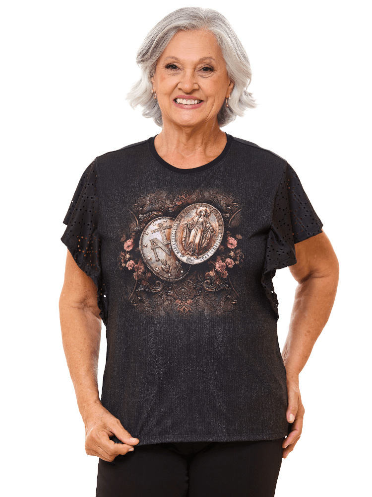 Blusa com estampa da Medalha Milagrosa de Nossa Senhora das Graças, um dos símbolos marianos mais conhecidos, sinal da proteção e intercessão de Maria para todos os que a usam com fé. A técnica de sublimação em alta definição garante riqueza de detalhes, enquanto as pedras especiais aplicadas à mão acrescentam um brilho intenso e exclusivo, tornando a peça ainda mais especial.