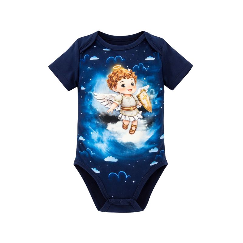 Body infantil de São Miguel Arcanjo, feito com carinho, conforto e muita fé.