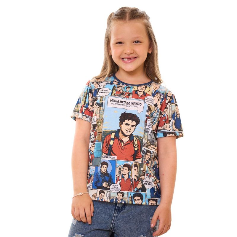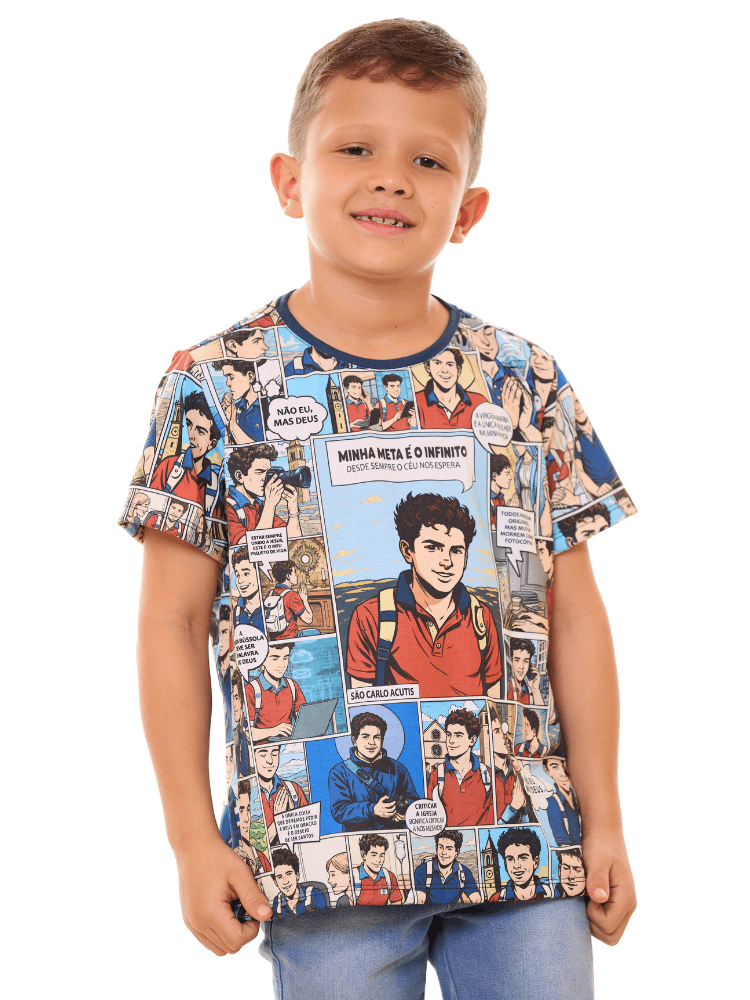 Camiseta infantil unissex com estampa de São Carlo Acutis, o conhecido como influencer de Deus, o padroeiro da internet, que dedicou sua vida à Eucaristia e ao uso da tecnologia para evangelizar.