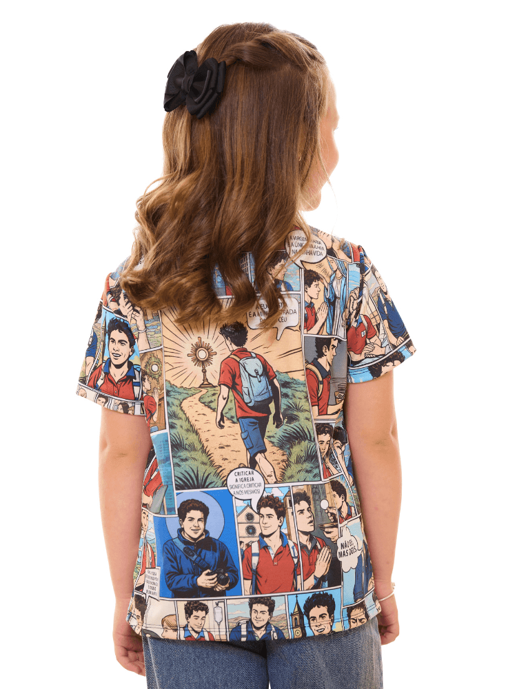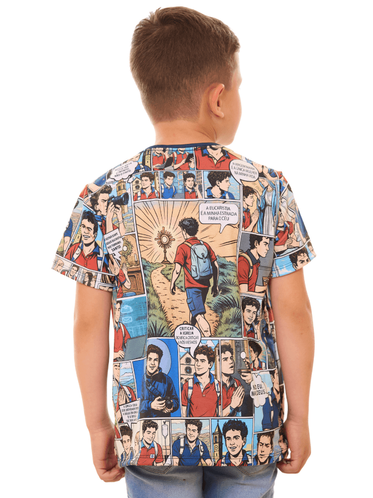 O diferencial desta peça está em sua arte exclusiva no estilo cartoon, que traz lindas ilustrações cheias de cor e expressividade, aproximando ainda mais os jovens da história e do testemunho de Carlo Acutis.