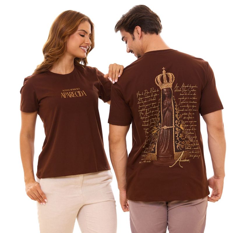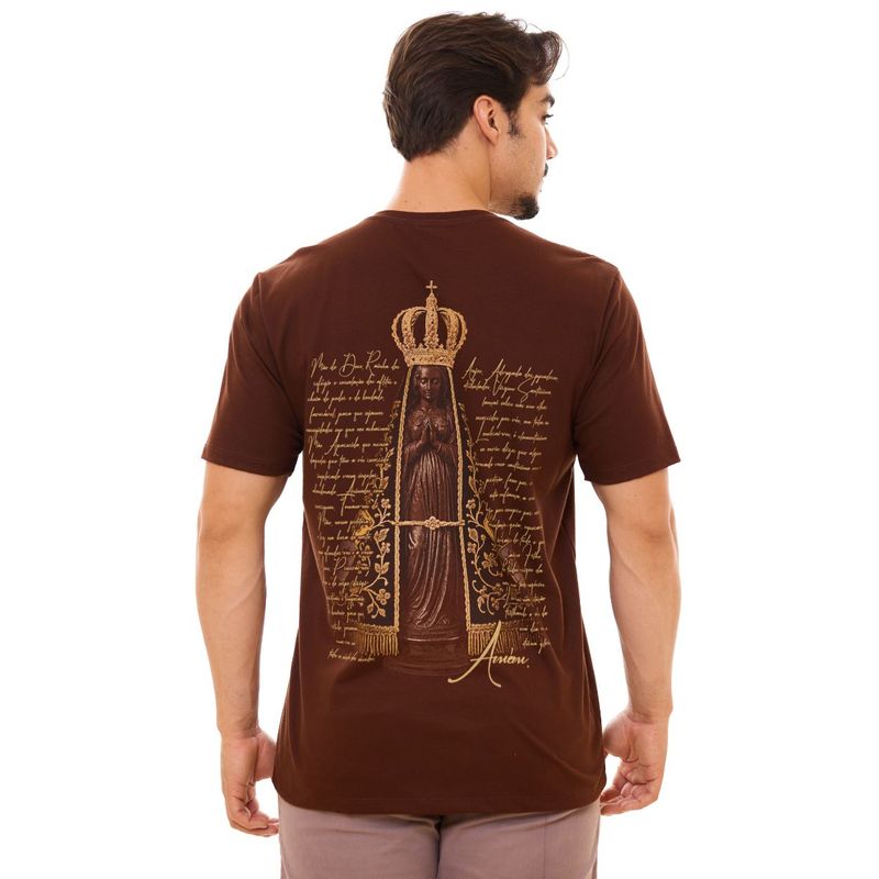 Padroeira do Brasil, Nossa Senhora Aparecida é homenageada nesta camiseta em silk de alta definição. Na cor marrom, a peça ganha sobriedade e versatilidade, ideal para quem deseja expressar sua devoção em conjunto.