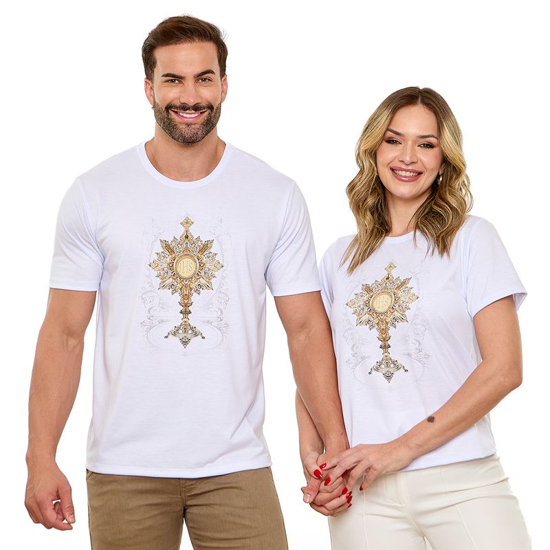 Camiseta católica Ostensório com aplicação em silk para um visual ainda mais sofisticado. Na cor branca, elaborada em tecido de altíssima qualidade e de conforto surpreendente. Perfeita para vestir em todos os momentos trazendo Jesus Eucarístico sempre junto ao coração. Disponível na versão feminina e masculina.