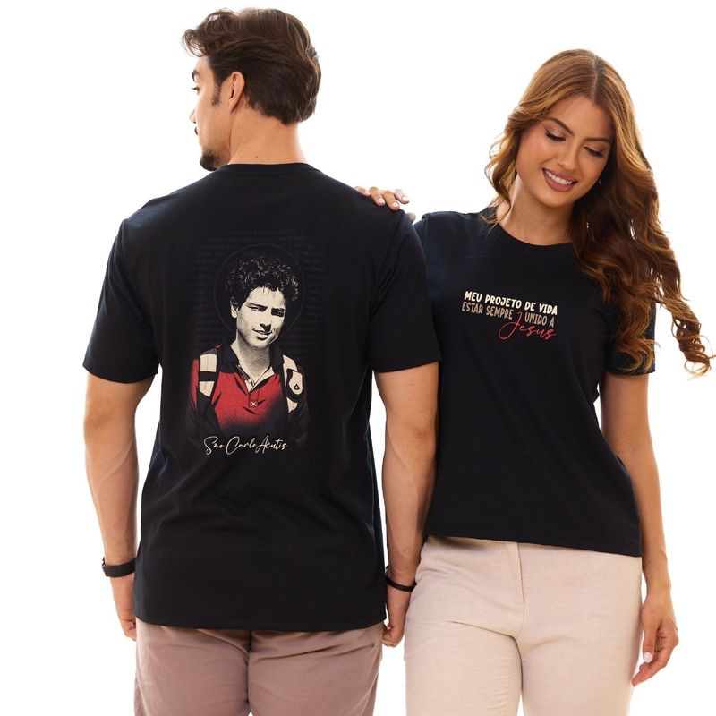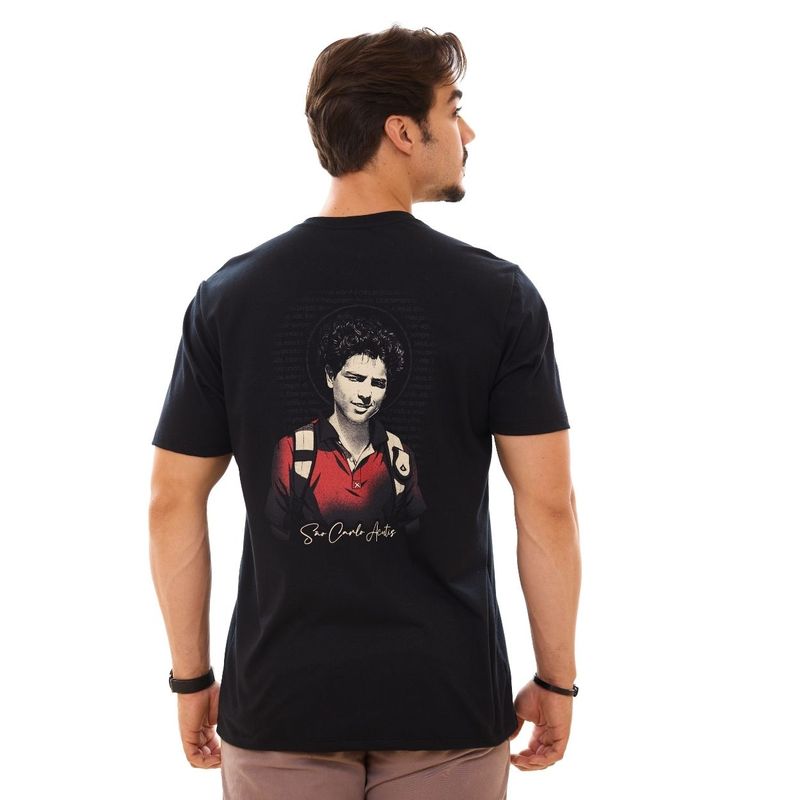 Camiseta com a imagem de São Carlo Acutis, em uma composição cheia de fé e reverência. Na cor preto, a peça transmite leveza e harmonia. Perfeita para ocasiões especiais levando sua devoção sempre junto com você. Disponível na versão masculina e feminina.