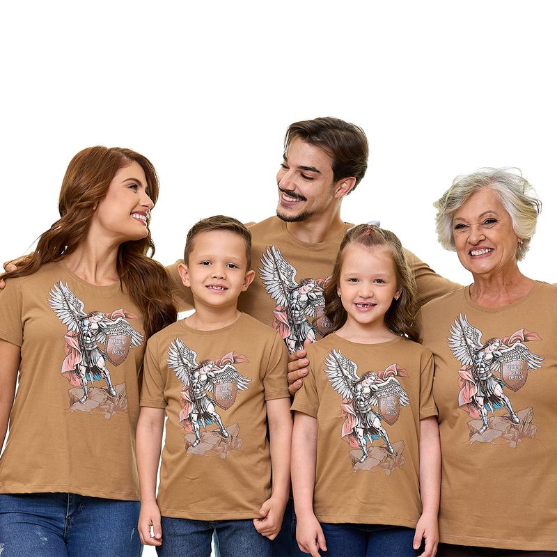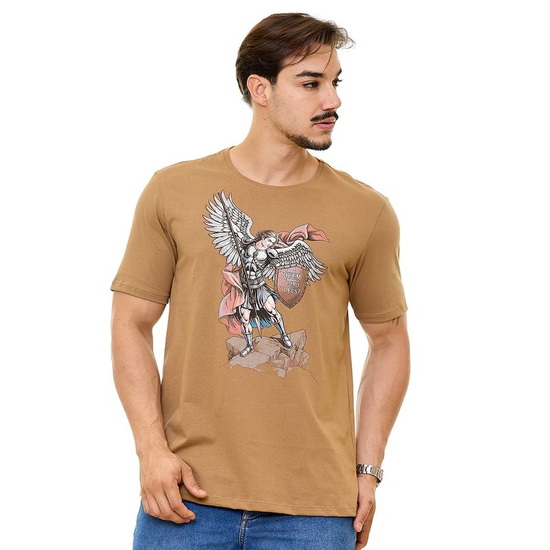 Camiseta em camurça com a poderosa imagem de São Miguel estampada em silk com traços especiais. A malha 100% algodão oferece conforto e toque encorpado, ideal para o uso diário ou momentos de oração.