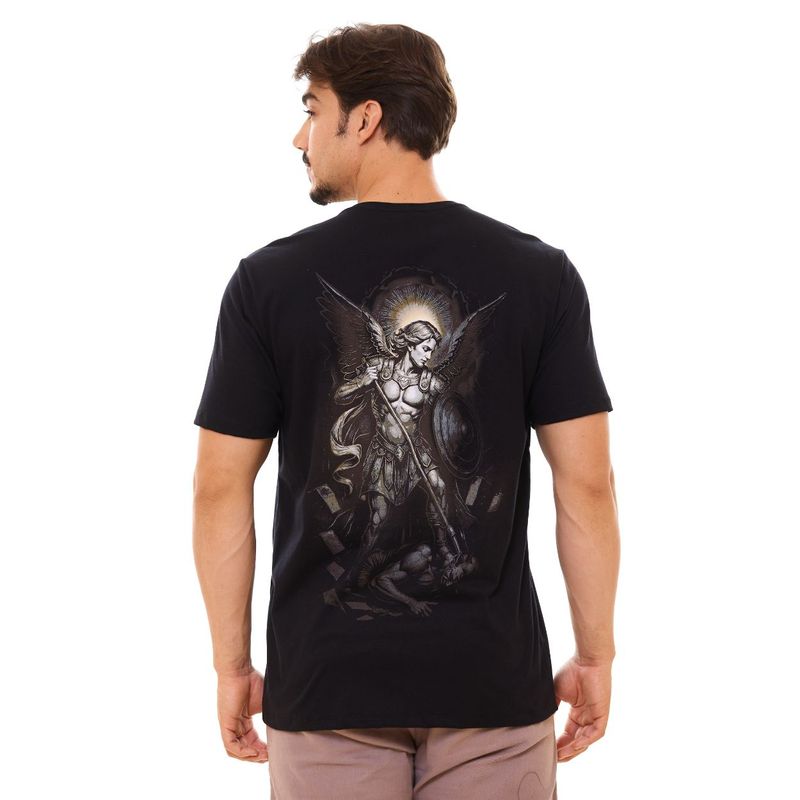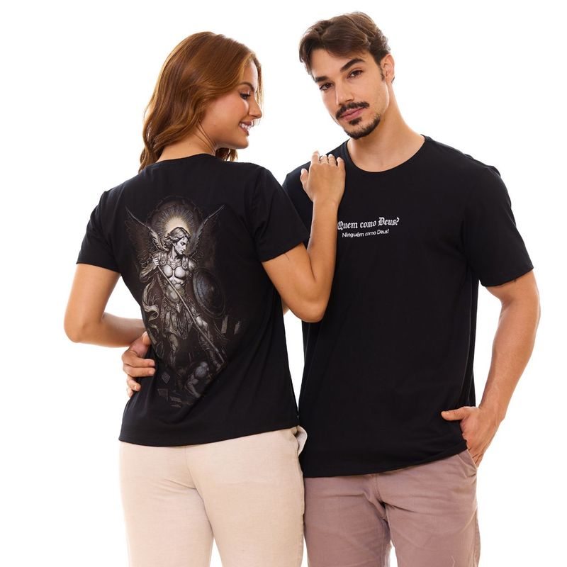 São Miguel Arcanjo, defensor do povo de Deus, é retratado nesta camiseta em silk resistente, que mantém a estampa nítida e bem definida. O modelo casal está disponível em preto e branco, cores que realçam a imponência da imagem e a força da devoção.
